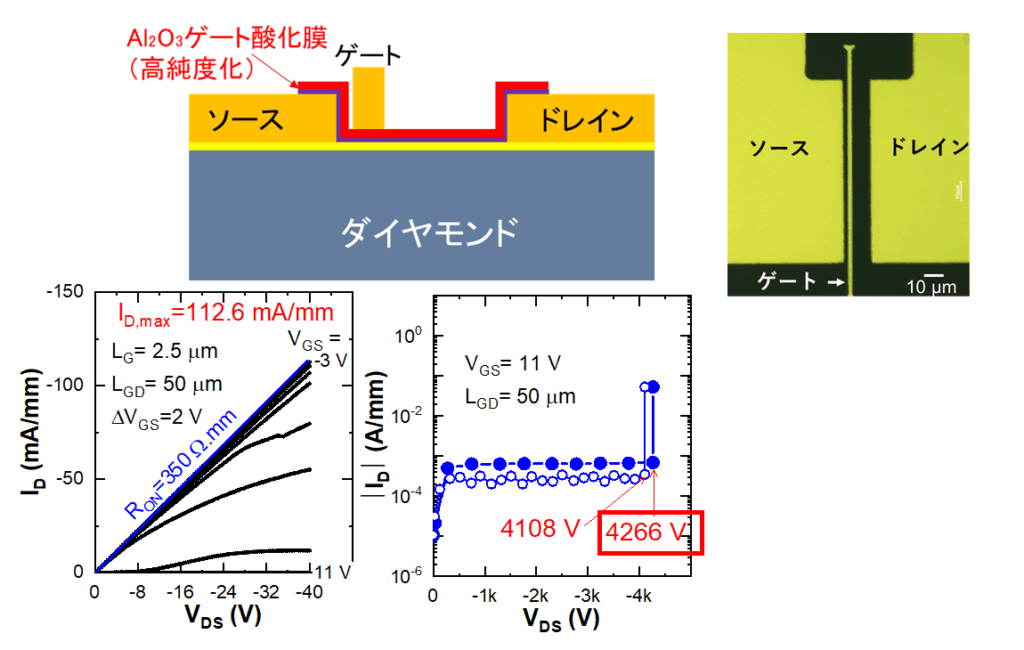 ・高純度原料を用いたダイヤモンドデバイスを作製し、オフ耐圧4266Vを達成