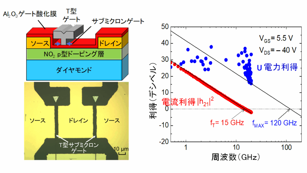 図5 ダイヤモンド半導体で120GHzの電力増幅利得の遮断周波数で動作