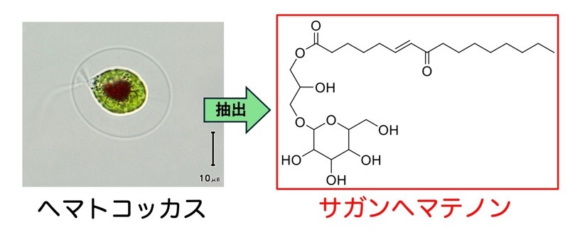 図1. 微細藻類ヘマトコッカスの顕微鏡写真と抽出されたサガンヘマテノンの構造