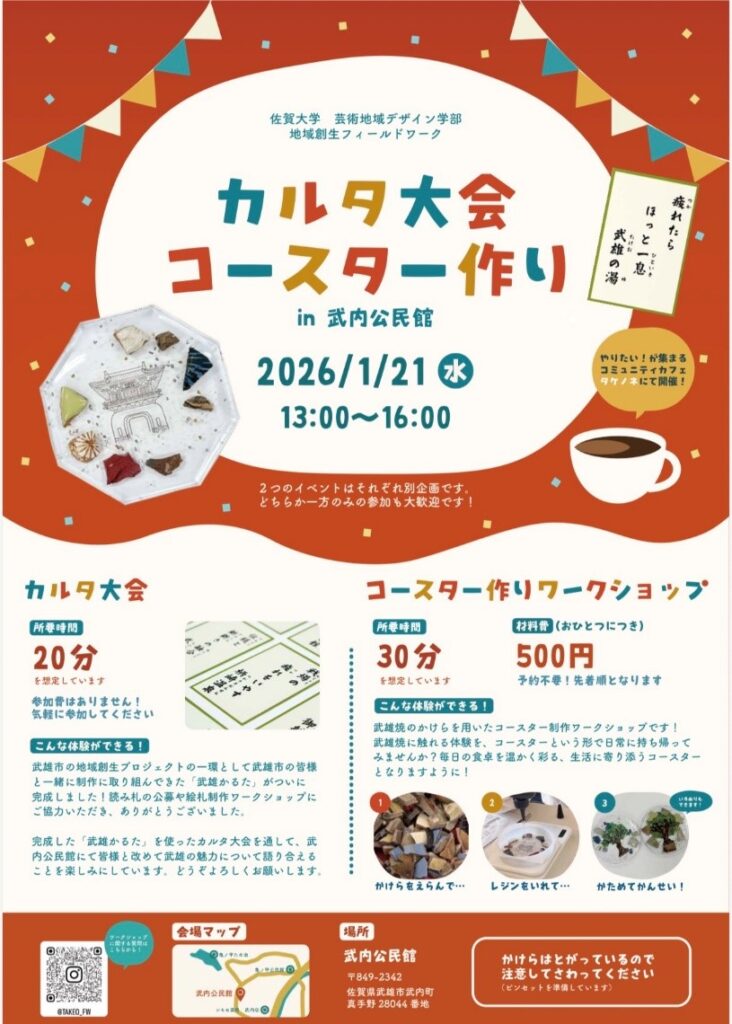 当日は、武雄焼のかけらを使ったコースター制作や「武雄かるた」を通じて、楽しみながら地域の想いや気づき=「タネ」を見つけていく2つの企画を実施します。本取組は、武雄市との連携協定に基づき実施している地域創生フィールドワーク講義の一環として行われます。町内外を問わず、どなたでも参加可能です。