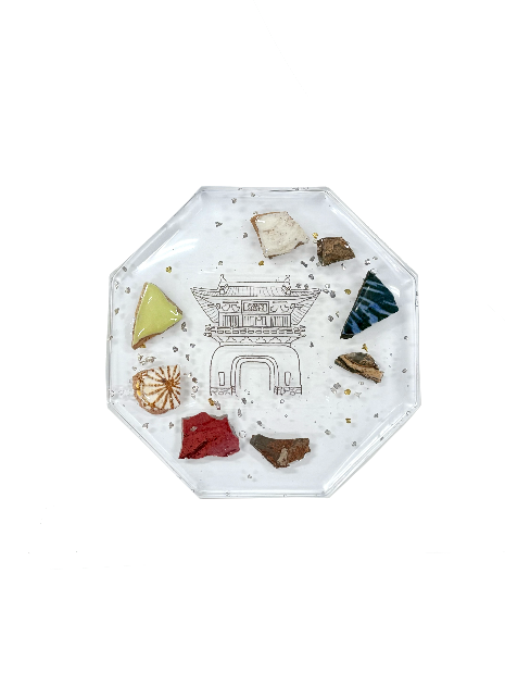 武雄焼のかけらに触れ、レジンを用いてオリジナルのコースターを制作します。