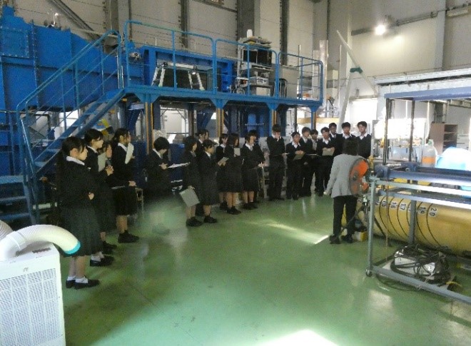 当日は、同研究所の森﨑助教による海洋エネルギーに関する講義が行われた後、生徒たちは班に分かれて施設見学を行いました。さらに、鶴准教授および森﨑助教の指導のもと、実験実習として海洋温度差発電の仕組みについて、模型や装置を用いながら丁寧な解説が行われました。