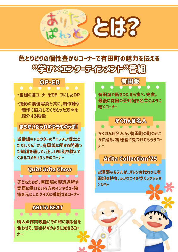 「ありたぱれっと」とは、複数のコーナーにて構成され、学び×エンターテインメントを主題として、大人も子どもも全年代が有田町の魅力を楽しく学べる教育番組風の映像となっております。
