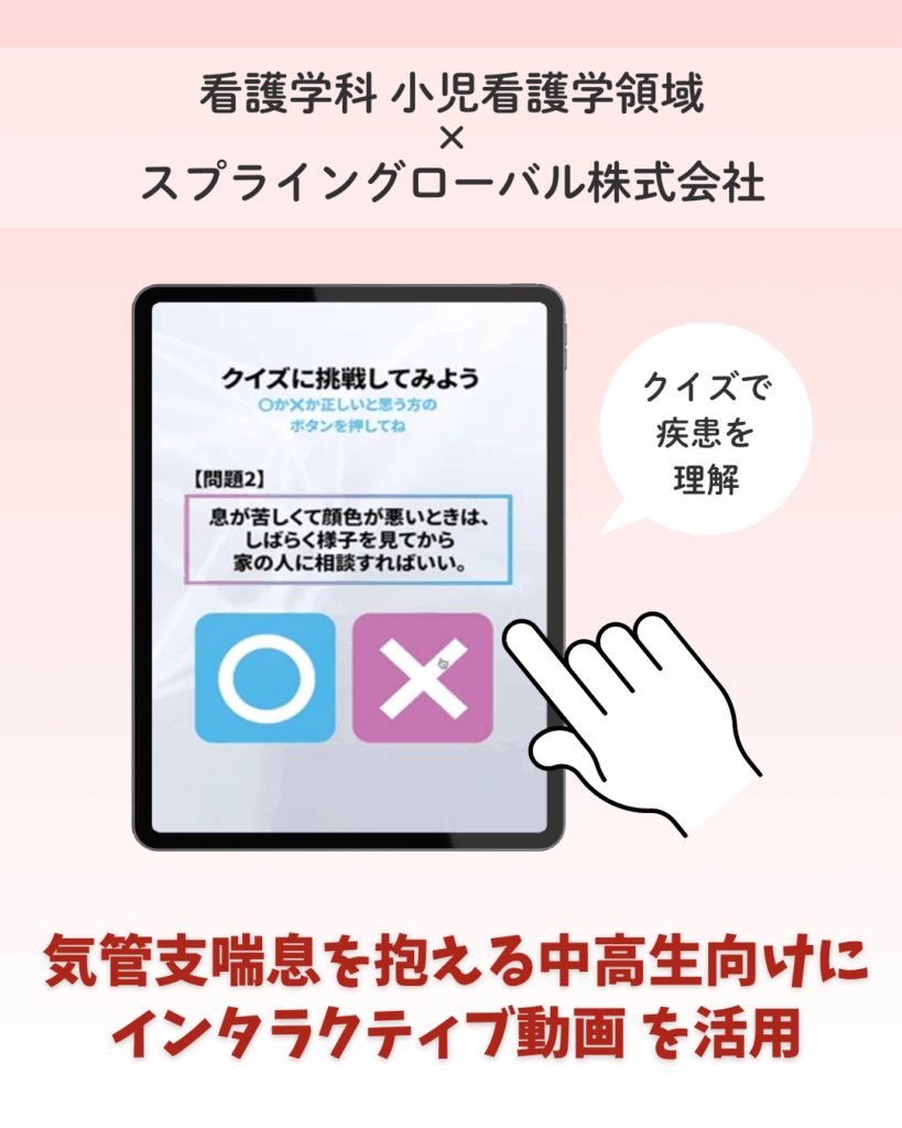 医学部看護学科 小児看護学領域では、スプライングローバル株式会社・附属病院呼吸器内科・嬉野医療センター小児科とともに気管支喘息を抱える中高生を対象とした教育研究プロジェクトを実施しています!