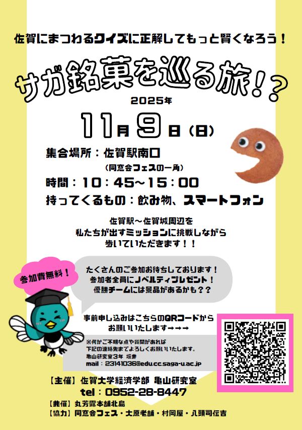 令和7年11月9日(日)に、佐賀大学経済学部亀山研究室(教授 亀山嘉大)の学生グループ(経済学部3年:牛島夕奈、坂井彩弥乃、経済学部4年:田中琉聖)は、まち歩きイベント「佐賀銘菓を巡る旅!?」を開催いたします。
