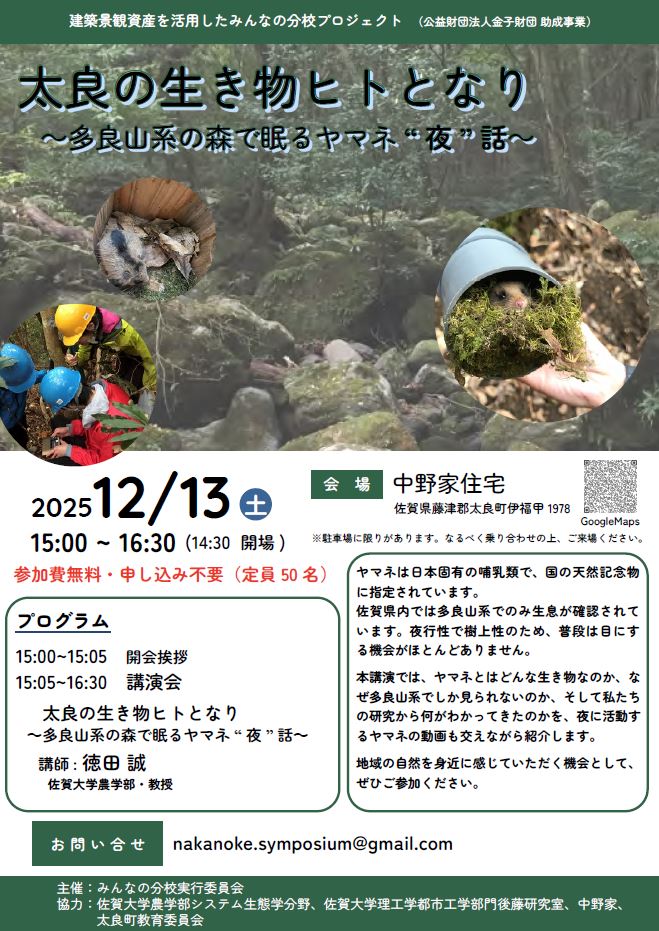 12月13日(土)には、佐賀大学農学部教授・徳田誠氏による講演会「太良の生き物ヒトとなり ~多良山系の森で眠るヤマネ“夜”話~」を開催。多良山系に生息する希少動物ヤマネの生態や地域との関わりについて、一般の方にもわかりやすく紹介します。