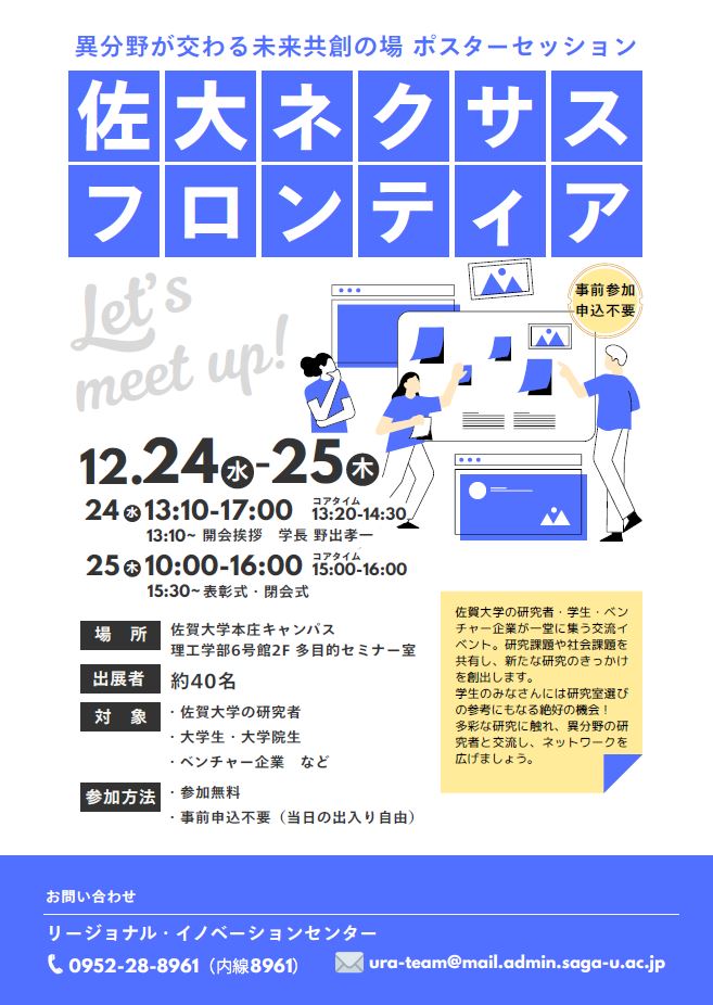 佐賀大学は、全学の研究者・学生が一堂に会し、学部や研究分野を超えた新たな研究連携とイノベーション創出を目指すイベント「第一回佐大ネクサスフロンティア」を開催します。