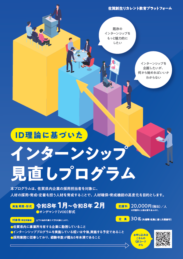 佐賀大学ウェルビーイング創造センターリカレント教育部門では、ID理論に基づいた「インターンシップ見直しプログラム」を令和8年1月より開始します。