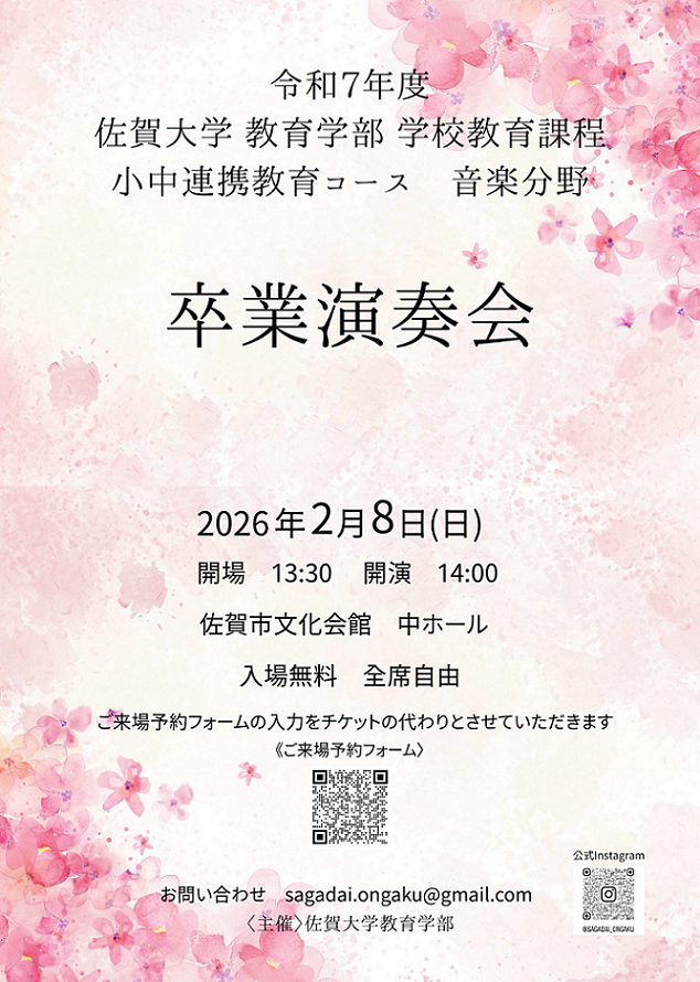 佐賀大学教育学部学校教育課程 小中連携教育コース音楽分野の卒業演奏会を開催いたします。音楽分野の卒業には<論文>