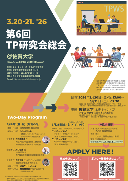 2026年3月20日(金・祝)から21日(土)にかけて、佐賀大学本庄キャンパスにおいて、ティーチング・ポートフォリオ研究会主催による「第6回TP研究会総会」を開催します。