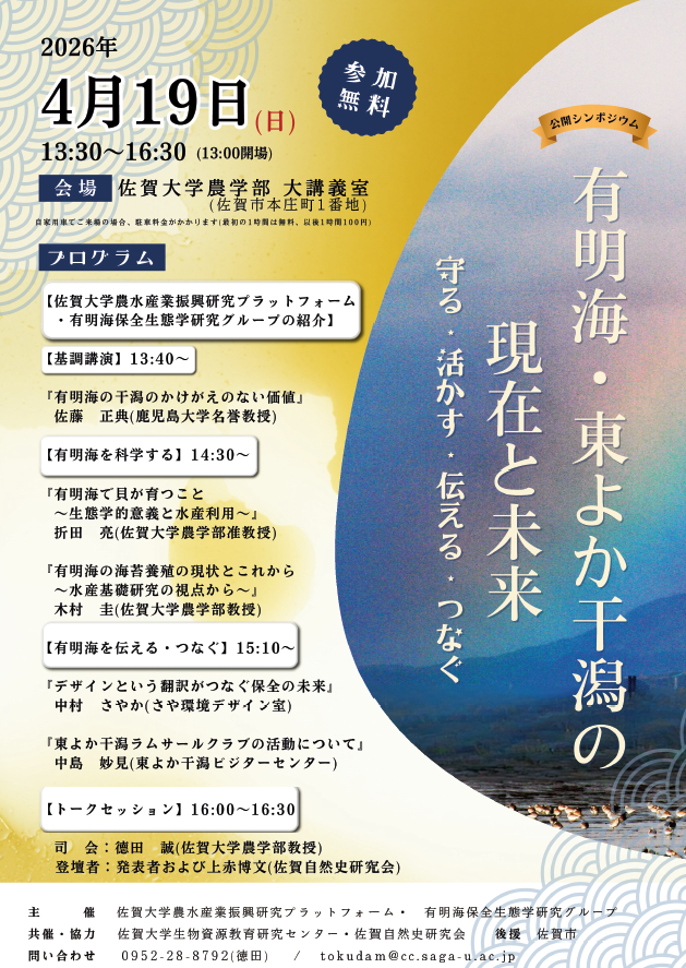 2026年4月19日(日)に佐賀大学農学部において、一般公開シンポジウム「有明海・東よか干潟の現在(いま)と未来:守る・活かす・伝える・つなぐ」を開催いたします(主催:佐賀大学農水産業振興研究プラットフォーム、有明海保全生態学研究グループ)。