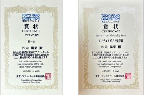 ・第15回東京ピアノコンクール アマチュア部門 ファイナル第1位併せてピアノ奨学賞(スカラシップ)受賞
