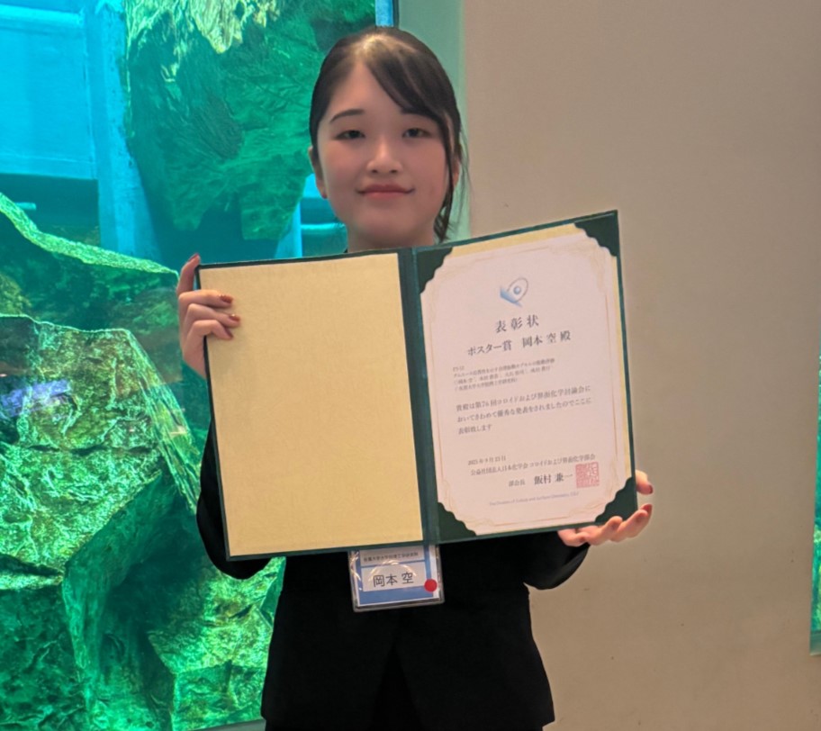 日本化学会 コロイドおよび界面化学部会が主催する第76回コロイド及び界面化学討論会において機能材料化学コース博士前期課程1年の岡本 空さんがポスター賞を受賞しました。