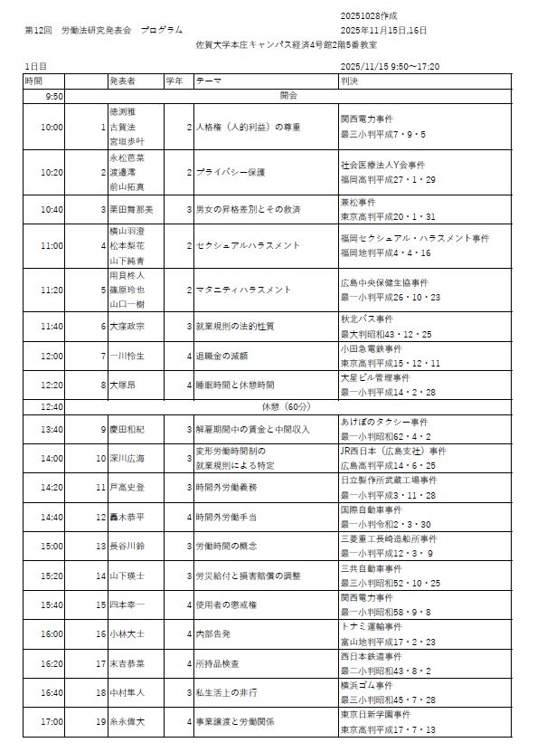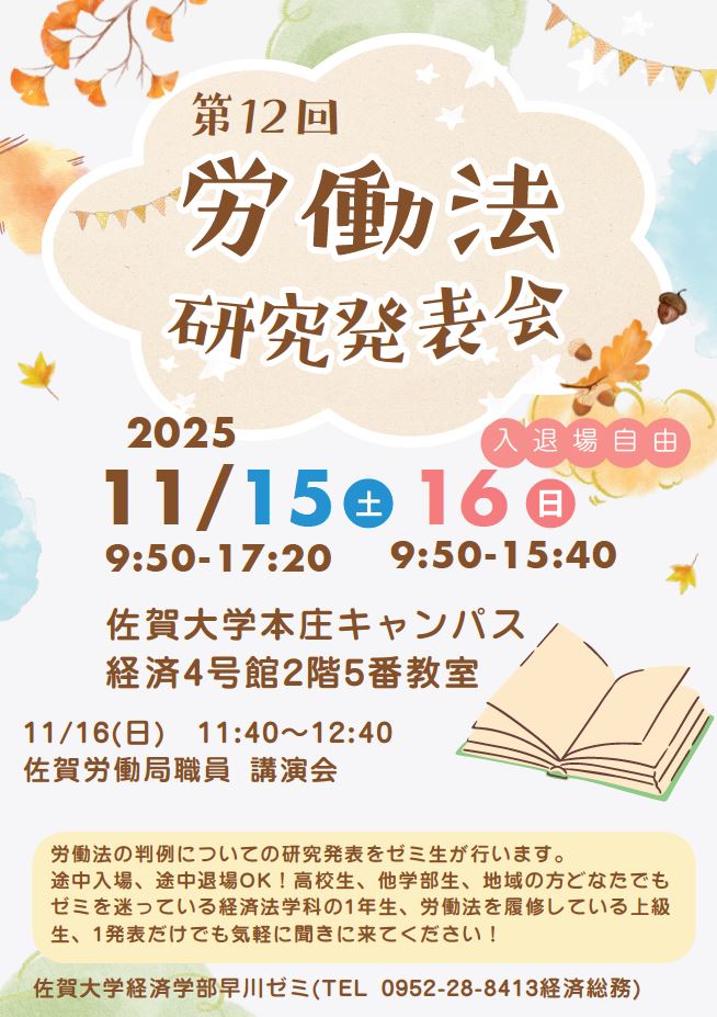 毎年、経済学部労働法ゼミ(指導教員:早川智津子教授)では、ゼミ学生による労働判例の研究発表を行う「第12回労働法研究発表会」を開催します。
