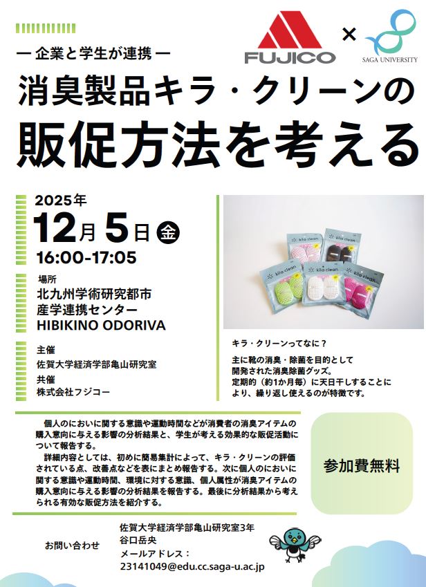 令和7年12月5日(金)に、佐賀大学経済学部亀山研究室(教授: 亀山嘉大)の学生グループ (経済学部3年:木村心優、谷口岳央、経済学部4年:本田圭賛)は、企業と学生の連携企画セミナー「消臭製品キラ・クリーンの販促方法を考える」を開催いたします。本学生グループは、若年層の光触媒製品購入意向を高め、安価で実用的な衛生管理手段の普及と「キラ・クリーン」の利用促進を目指して活動してきました。現状、若年層(10代後半~20代前半)は他人のにおいを気にする傾向が強く、特に運動後に使用できる携帯性・持続性・安全性に優れた消臭アイテムを求めています。その点で、環境・人体に優しい光触媒製品「キラ・クリーン」は適した選択肢の一つと捉えております。
