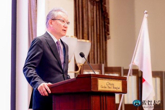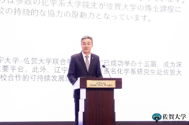 冒頭、野出学長が挨拶に立ち、長谷川綾子在上海日本国総領事館広報文化部長をはじめとする来賓、協定校、そして同窓生への深い感謝を表明しました。特に学術、佐賀県と遼寧省との交流を基盤に本学とも長きにわたり学術交流を続ける協定校として、羅文波遼寧師範大学学長、霍春輝遼寧大学副学長にご臨席いただいたことに、心より感謝を伝えました。