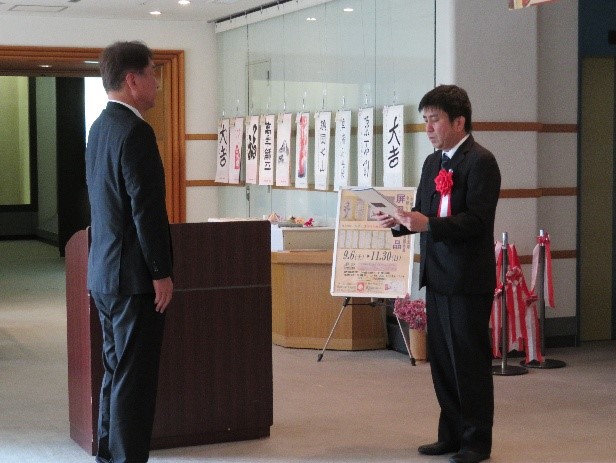 大野教育長に図録・史料集を贈呈する伊藤センター長