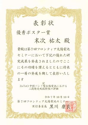 理工学研究科理工学専攻電気電子工学コース博士前期課程2年の末次 祐太さんが、2025年10月9日(木)~10日(金)に開催された第7回フロンティア太陽電池セミナーで優秀ポスター賞を受賞しました。