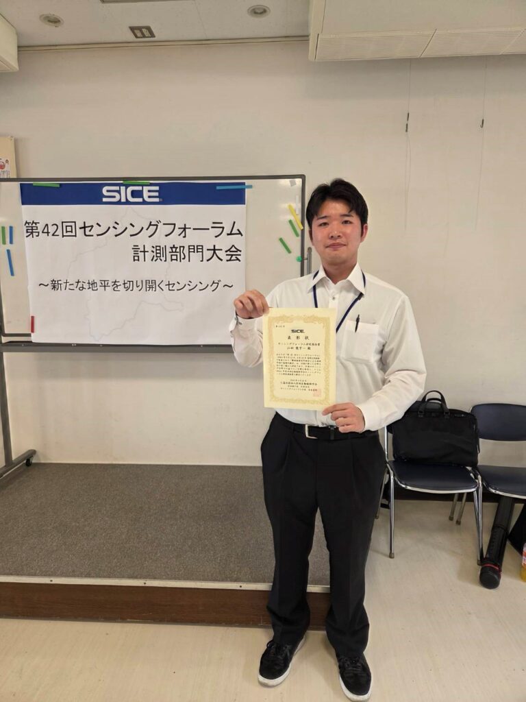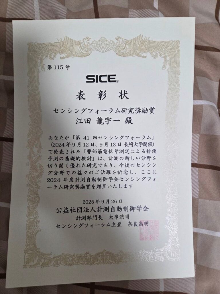 このたび、江田さんの発表内容とプレゼンテーションが高く評価され、2025年に開催された第42回センシングフォーラムの表彰式において、研究奨励賞が授与されました。今後の益々の活躍が期待されます。