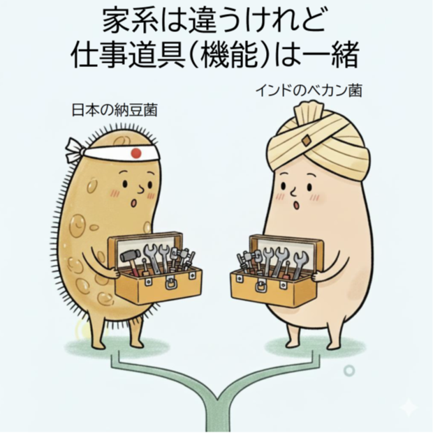 つまり、このベカンの菌は「生まれ(家柄)」は違うのに、大豆を発酵させるための「職業スキル(遺伝子セット)」は日本の納豆菌とほぼ同じだったのです。これは、細菌たちが「大豆発酵」という特定の環境で生きていくために、必要な遺伝子セットを獲得または維持し、進化した可能性を示唆しています。