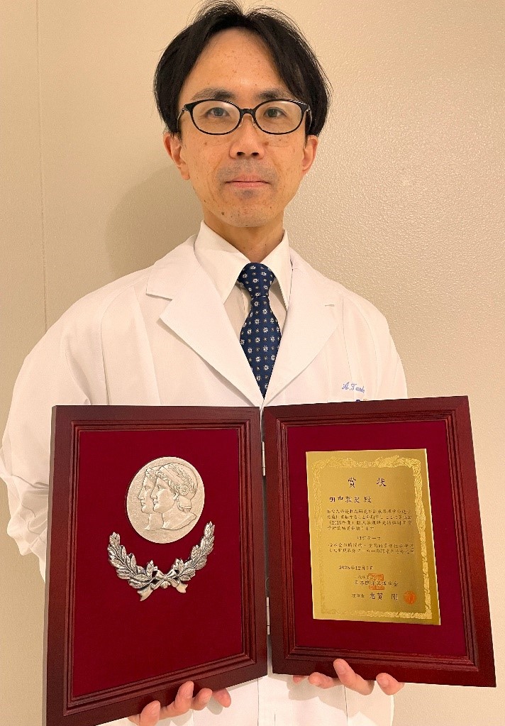 【臨床薬理研究振興財団賞学術奨励賞の賞状と田中特定教授】