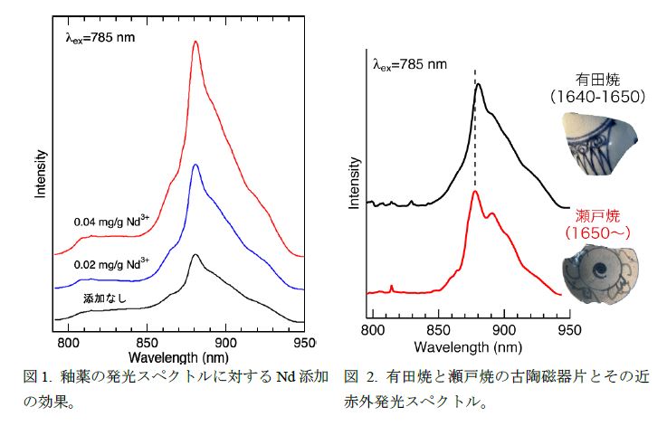佐賀大学と佐賀県窯業技術センターの共同研究チームは陶磁器の釉薬が示す近赤外領域の発光が主原料である長石に由来することを明らかにしました。また、長石に含まれる希土類元素の一つであるネオジム(元素記号Nd)が発光の原因となる元素であることを解明しました。さらに、17〜19世紀の古陶磁器片について釉薬からの近赤外発光スペクトルを測定したところ、佐賀県の有田地区および愛知県の瀬戸地区から発掘された陶片では違いが見られ、古陶磁器の産地同定などへ応用できる可能性が示唆されました。
