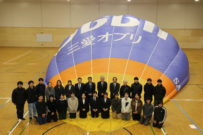 令和8年1月23日(金)には、新たな球皮の寄贈を受け、三愛オブリ株式会社 代表取締役社長 隼田様らをお迎えして感謝状贈呈式を開催しました。式典では本学より謝意を表するとともに、体育館にて新気球が披露され、学生にとって大きな励みとなる機会になりました。