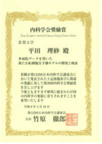 佐賀大学医学部附属病院総合診療部 平田理紗助教が内科学会奨励賞を受賞