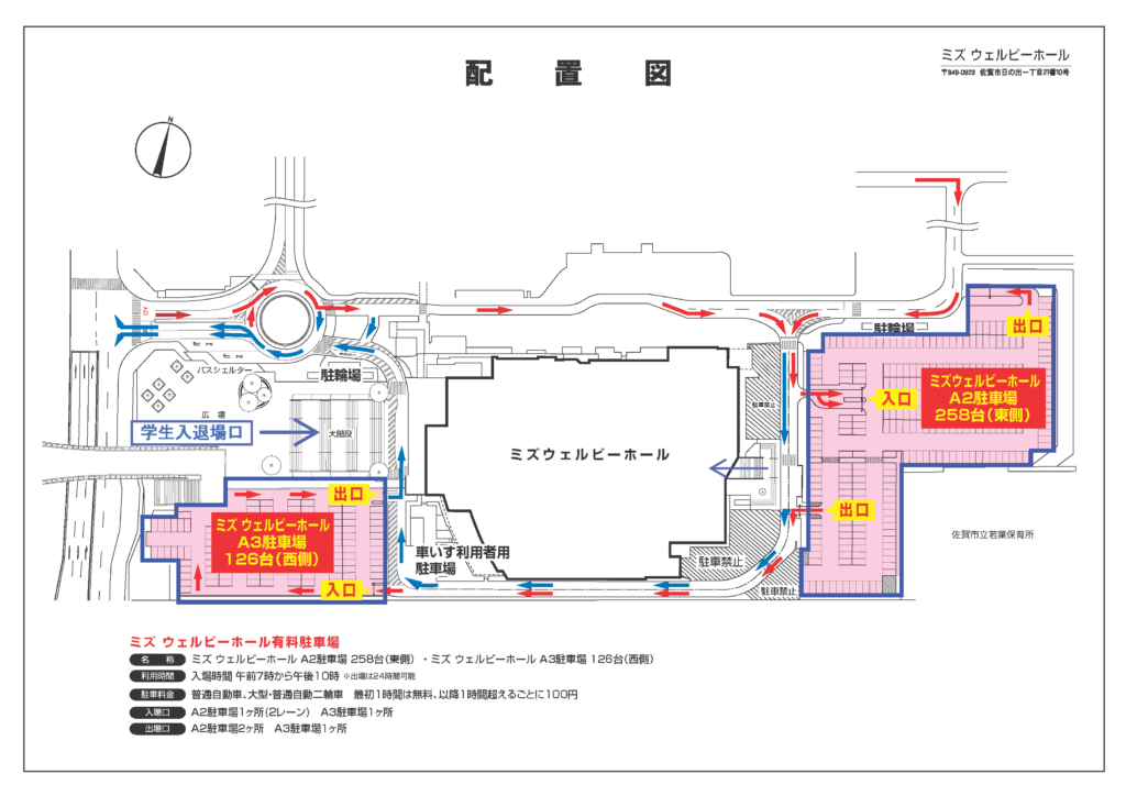 ※ミズ ウェルビーホールにはA3駐車場(西側)及びA2駐車場(東側)がありますが数に限りがあります。(毎年駐車場が混雑しております。)